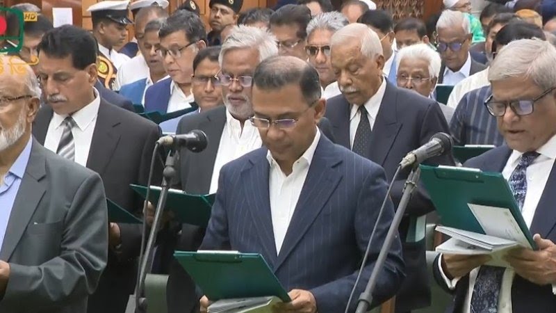 বিকেল ৪ টায় শুরুতে দেশী ও বিদেশি আমন্ত্রিত অতিথিদের সামনে প্রধানমন্ত্রী হিসেবে তারেক রহমানকে শপথ বাক্য পাঠ করান রাষ্ট্রপতি মো.সাহাবুদ্দিন। ২৫ পূর্ণ মন্ত্রী ও ২৪ জন প্রতিমন্ত্রীকে শপথ বাক্য পাঠ করানো হয়।